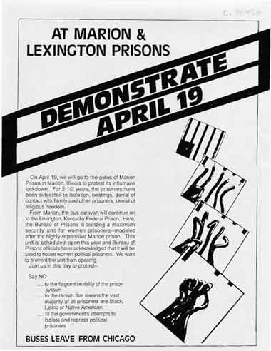 As I’ve said, we had told ourselves that this was an ad hoc, one-time conference, and that afterwards we would return to our other political work. But when it was over the energy and excitement that had been generated drew us in, and we could not bring ourselves to walk away. We also realized that no one else was taking on this difficult but necessary work. Soon after the conference, the National Committee to Free Puerto Rican Prisoners of War and the National Committee to Defend New Afrikan Freedom Fighters informed CEML they were planning a joint demonstration at Marion and Lexington, Kentucky on April 19th and asked for our participation. The BOP had announced the opening of a new control unit for women at Lexington and had already acknowledged that it would be used to house women political prisoners. On the heels of our conference, the John Howard Association, an Illinois prison reform group, released a 20-page report based on their recent inspection of Marion. We felt their observations and recommendations were mild, but welcomed them nonetheless as another voice of concern. More importantly, we doubted that without a grassroots, activist movement the Bureau of Prisons would be responsive to any observations, recommendations, etc. If a Congressional Subcommittee could not alter the situation, how could prison reform groups have an impact? The only way to proceed, we felt, was to build an actual grassroots movement that would be out in the streets demanding change. We agreed immediately to participate in and co-sponsor the April 19th demonstration, with the idea that it might generate momentum and afterward other people would take up the cause while we went back to our other political work. This was, after all, an important opportunity not only to support the logistics of the demonstration, but also to organize around the issues that had motivated us to hold the conference in the first place. We knew it would be difficult, not only because we would have to convince other white people to attend this 30-hour demonstration at two prisons in two different states, but also because we would have to produce literature, hold many meetings, and provide financial support. As our first step, we enlarged the committee by appealing to many of the people who had helped us with the conference. Each person we approached agreed to help—some joined the committee and others made it clear that while they could not work regularly on the demonstration, they would be willing and eager to attend and help whenever they could. We produced a pamphlet for the demonstration as well as a more general pamphlet about Marion and Lexington that would become a primary piece of literature in our work. |