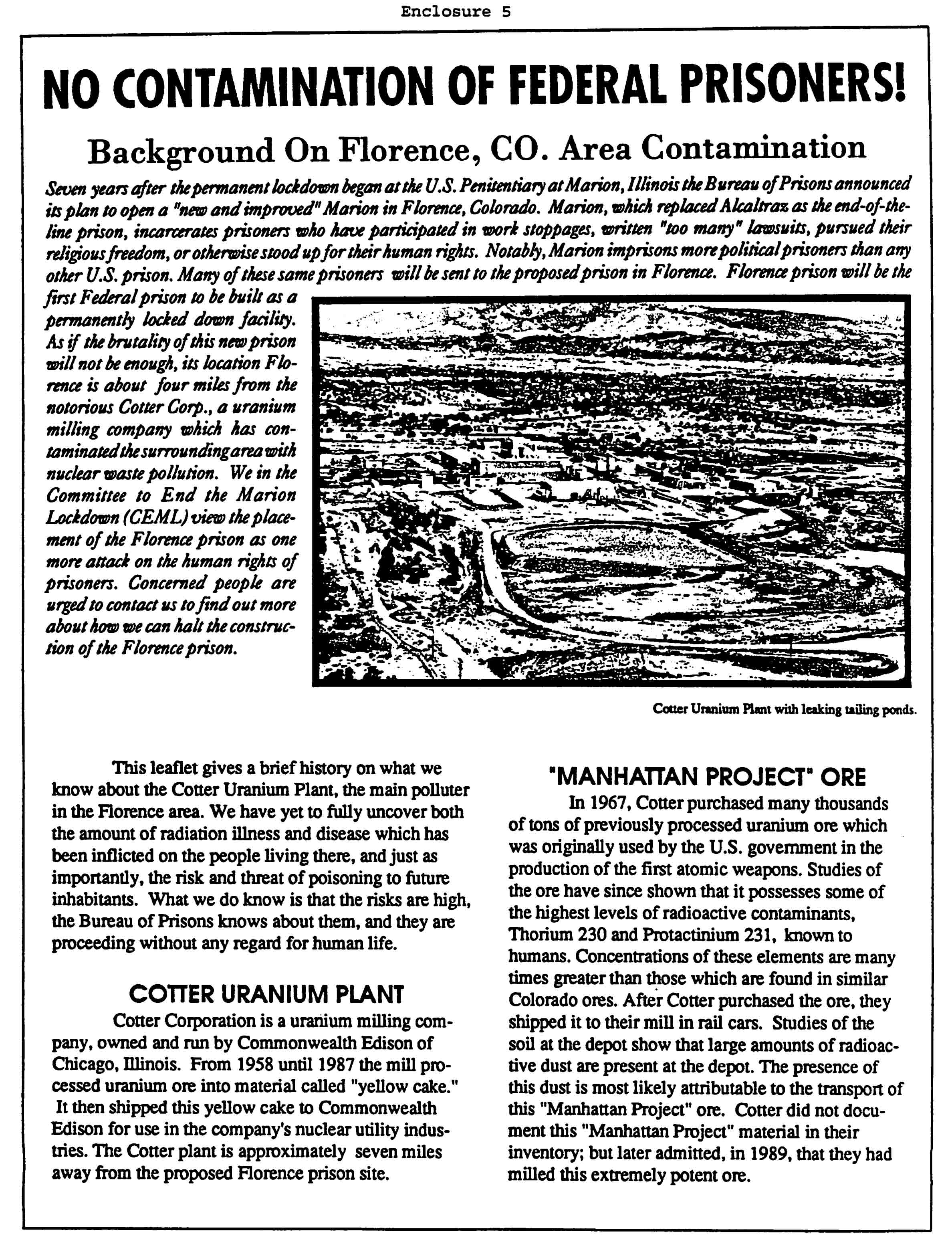 In early 1990, while we were engaged in the water campaign, the Bureau of Prisons (BOP) announced its decision to open a new prison in Florence, Colorado. In July the BOP broke ground on the $150 million project. It would be a giant prison complex, 600 acres in a small town 60 miles west of Colorado Springs, with four different levels of security units. The minimum and medium security units of a thousand beds would open in 1992. The high security facility and the even higher security “administrative maximum” prison—Marion’s replacement—would open in 1993, each with 550 beds. The BOP’s alleged motivation for creating this “Ad Max” within a multi-million dollar complex in the middle of nowhere was that Marion was imperfect because it had not been built as a control unit prison. In contrast, we saw the new prison as an even greater opportunity for evil, a high-tech version of Marion. Many skeptics thought this was an effort to move the BOP’s flagship torture chamber further away from Chicago, the center of its greatest opposition. CEML decided to co-sponsor, along with the National Committee, an organizer’s conference, to develop a national campaign to prevent the new and more perfectly evil Marion from opening in Florence. Preparation for the conference included mailings, several presentations at Chicago events, and the publication of a pamphlet, “Resistance Won’t Stop,” a collection of comments by Marion prisoners about the proposed prison at Florence. We also felt it was important to have a pre-conference fact-finding and coalition-building trip to Colorado. In late October, Steve, Mariel, and Tim drove the 20 or so hours each way to Colorado. Before their leaving, we sent letters and information packages to all reporters in Colorado who had written articles about the planned prison, told them about the trip, and asked to meet with them. The response was substantial. Some reporters even called Chicago and conducted interviews before the three people hit the road. After driving through the night, the three arrived in Colorado Springs mid-Thursday and met with a small group of friends and a correspondent for the National Catholic Reporter. CBS then conducted an interview which aired in Denver as the lead story that evening. The evening was spent with the local chapter of the National Lawyers Guild where the 20/20 segment about Marion was shown, and discussion ensued about the conditions at Marion and what that might mean for a new prison in Florence. The following morning the trio set off for Florence and the adjacent Cañon City. It was a startling place, home to at least six state prisons, including a state control unit prison. After meeting with kind and helpful friends, the reporter from the Cañon City Daily Record interviewed the three and the headline would be: “Group vows to stop FBP (Federal Bureau of Prisons) penitentiary.” Next stop was a trip to look over the prison site itself. The three reported: We were staggered by what we saw. One follows directions and signs towards the prison and then makes a turn onto an unmarked road. After that, there is nothing; the area is literally barren. The three of us imagined that this must be what the surface of the moon is like. After driving a couple of miles more we located the site and watched, in pain, as the bulldozers cleared the land for what might become the prison that will house those the Bureau of Prisons wishes to destroy. (Walkin’ Steel, v. 1, no. 1, p. 3) The following day were press conferences and community meetings in both Pueblo and Denver, and then time for a quick drive up into the spectacular mountains, a real treat for the Illinois flatlanders. After an exciting Saturday community meeting, they packed up and drove through the night, arriving in Chicago early Sunday evening. Monday morning they’d be back at their day jobs. Upon their return, they reported on the difficulties involved in building support to challenge the prison. The political climate in Cañon City and Florence seemed overwhelmingly in favor of this institution that we saw as a torture chamber. According to an article in a Denver area publication, Westword, the county had raised $160,000 to purchase the 600-acre site. Four hundred locals had gathered for the ground-breaking. T-shirts with a map of the site were sold out at $7.99. In July the BOP hosted a housewarming barbecue and 1,000 local residents attended. A job fair at Florence High School drew hundreds more. Ten years ago when new prisons were proposed, the general climate was often to run prison authorities out of town. Now, due to increasing economic hardship, new prisons were welcomed with open arms. With unemployment in the area at 17%, it was estimated that this new prison complex would generate 1,000 temporary jobs and 750 to 900 permanent jobs, with an annual payroll totaling $44 million. A former inmate of Marion was quoted in Westword as saying, “Yes, the people of Florence have problems with jobs, but what they should do is pressure the government for another kind of industry, one that is less willing to make money from people’s suffering. The government is sneaky. They’re buying Florence’s loyalty.” Steve was quoted in the same article: “It’s equivalent to working on a slave ship. I would say to the people of Florence that I understand your economic dilemma, but you’ve made a wrong moral choice. How different are they from the people who worked on the slave ships?” In November we held our annual conference in Chicago, this time on the 7th anniversary of the lockdown. Billed as an organizer’s conference, the focus would be to try to stop the new proposed federal prison in Colorado. Attendees came from as far away as New York, Colorado, Wisconsin, Michigan, Minnesota, Kansas, Missouri, and Canada. The afternoon workshops were primarily working strategy sessions. Erica Thompson of CEML moderated the first workshop, entitled “Organizing