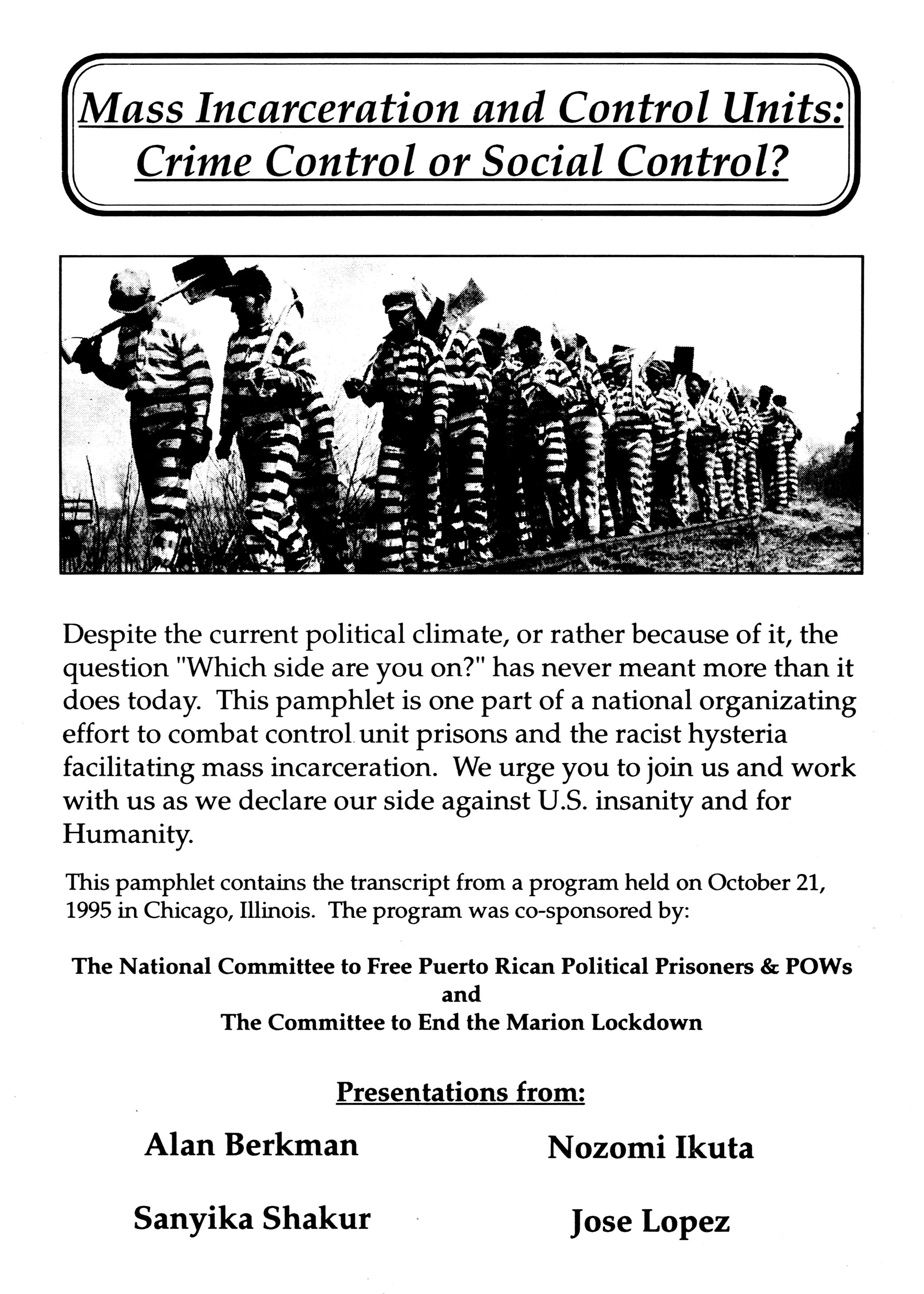 Nozomi also candidly pointed out that in our attempt to build a national campaign “we were perhaps unrealistic in our initial plans, and suffered from the lack of an adequate structure to carry the campaign forward as effectively as we would have hoped.” The third speaker of the evening was to be Sanyika Shakur. We had never met him, but his autobiography, Monster, detailed Los Angeles gang life and was on many bestseller lists. Two weeks before our program, Sanyika was released from Pelican Bay and was assured by the California Parole Board that he could travel to Chicago. At the last moment, however, the Parole Board reversed its decision, so his presentation came to us via a videotape we showed that night. As the brochure indicates, Sanyika described his emergence from thug-life to political awareness, from gang member to Black revolutionary. He noted over and over that his incarceration in California control units was a function of his political consciousness and behavior, not a result of any criminal activity. This transcription of Mass Incarceration and Control Units (p.20–25) remains to this day one of Sanyika’s most eloquent expositions of his political growth. |