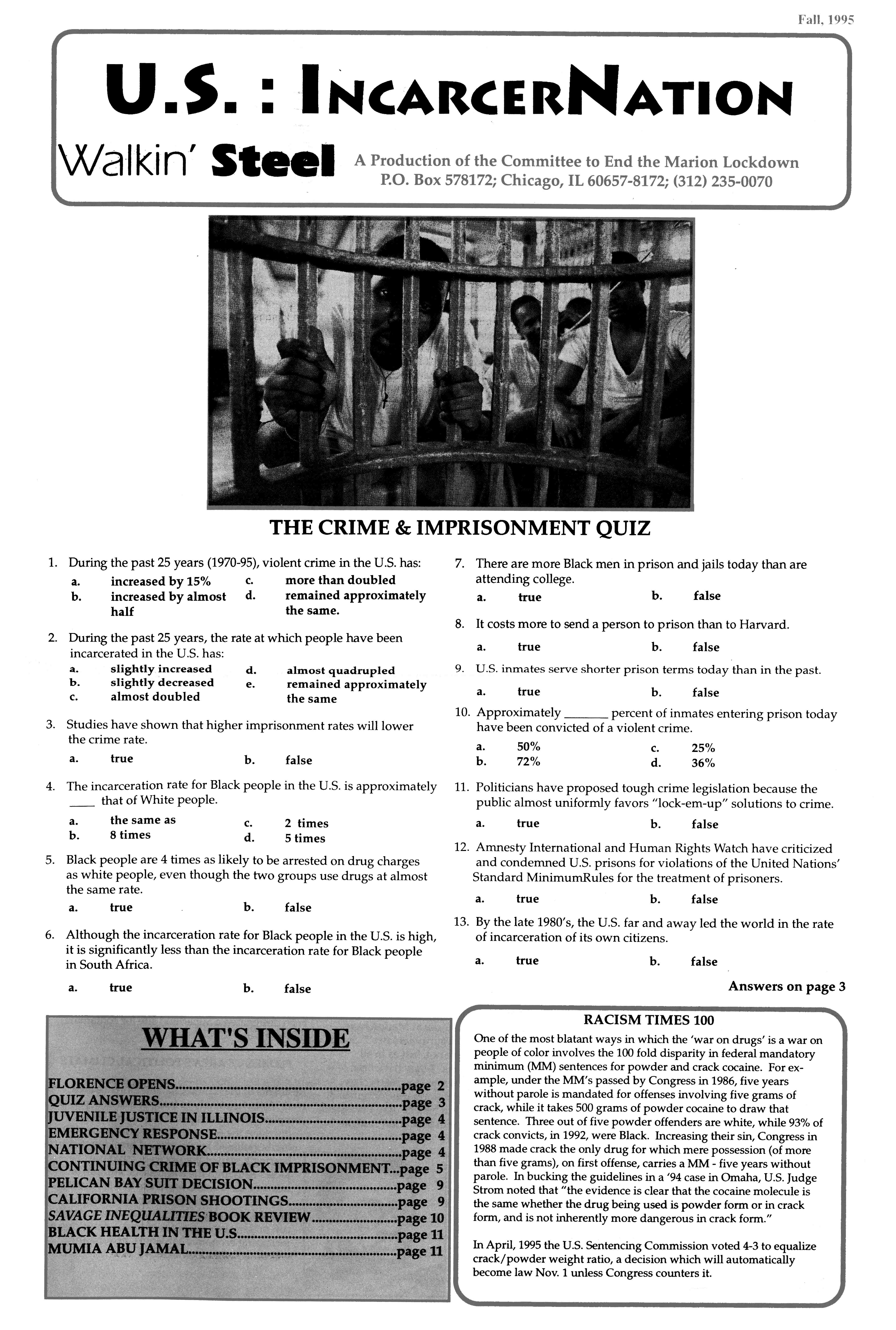 Meanwhile we continued the prison work, sometimes as the Committee to End the Marion Lockdown and sometimes as CCRIB, as part of the National Campaign to Stop Control Unit prisons. We spent a good deal of time in conference calls, having conversations with people doing the work in other places. The calls were set up by Bonnie Kerness of the American Friends Service Committee in New Jersey. I had never been on those kinds of conference calls, and I found them somewhat difficult and less than fully productive. Always trying to be aware of eliciting and giving public space to the voices of prisoners, in the summer of 1995 we requested and received from Edele a list of prisoners in the Florence ADX. We wrote to each of them to see if they’d like to write a statement about what they had experienced there. We received about 10 responses which, in preparation for our October program, we typed, copied, and distributed as Reflections On the First Year of the Control Unit at Florence.” That fall we produced a new 12-page edition ofWalkin’ Steel. It included a clever quiz about imprisonment developed by CEML’s Tony Hintze that was subsequently picked up by numerous other publications. (The reader can view Tony’s reflections on his own imprisonment as a result of his conscientious objection to the Vietnam War.) This issue of Walkin’ Steel was full of articles about Florence by our friends in Colorado, “The Continuing Crime of Black Imprisonment,” reports on the National Campaign, information on youth and imprisonment and women in prison, a piece by Mumia Abu-Jamal, and more. On October 21 we once again co-sponsored with the National Committee our annual fall program, the eleventh such program! We taped the evening program “Mass Incarceration and Control Units: Crime Control or Social Control?” then later transcribed and printed the remarks. I began by reminding people that several years ago we in CEML had printed a statistic that one out of every four Black men in the U.S. was under some form of control—that is either in prison or jail or on parole or probation—and that the week before this program, the Sentencing Project in Washington, D.C., released a new study revealing that the proportion was now one out of every three Black men! In D.C. and Baltimore, the proportion, as reported the year before by Jerome Miller, was one out of every two Black men under some form of control. The speakers that evening were Dr. Alan Berkman, Rev. Nozomi Ikuta, Sanyika Shakur, and Chicago’s (and Puerto Rico’s) own José López. Alan Berkman was an extraordinary man. When I first met him in the 1970s, he chose to practice medicine in places like the South Bronx and Lowndes County, Alabama where doctors were as scarce as in the poorest of Third World countries. In the ‘60s and ‘70s with the emergence of revolutionary movements, Alan used his experience and skills to support Black, Puerto Rican, and Native American movements. He was at Wounded Knee, South Dakota, during the historic occupation and confrontation between the U.S. government and the American Indian Movement. |